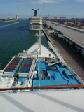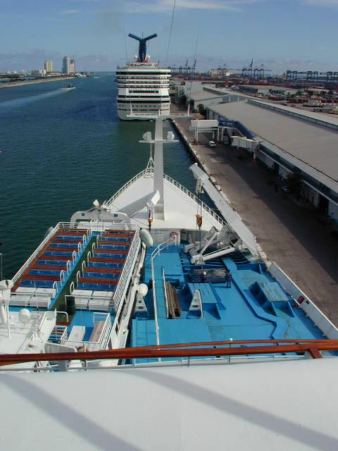 The ship as seen from the boarding area in the Miami port.